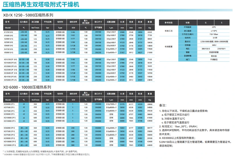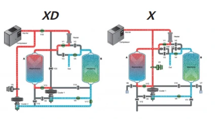 XD- tai X-puristuslämmön adsorptiokuivaimet käyttävät korkealaatuisia adsorbentteja ja hyödyntävät tehokkaasti öljyttömän kompressorin puristuslämmön adsorptioaineen regeneroimiseen, mikä vähentää merkittävästi energiankulutusta ja ylläpitokustannuksia.