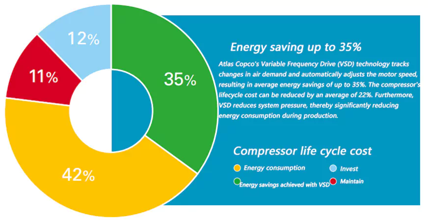 Energiankulutus on yli 80 % öljyttömän ruuvi-ilmakompressorin elinkaaren kokonaiskustannuksista. Lisäksi paineilmatuotannossa käytetyn sähkön osuus tehtaan sähkön kokonaiskustannuksista on yli 40 %. Energiakustannusten alentamiseksi Atlas Copco on edelläkävijä Variable Frequency Drive (VSD) -teknologian paineilmateollisuudessa. VSD ei ainoastaan säästä merkittäviä määriä energiaa, vaan myös suojelee ympäristöä tuleville sukupolville. Jatkuvien investointien ansiosta Atlas Copco pystyy tarjoamaan markkinoiden laajimman valikoiman integroituja VSD-kompressoreita.