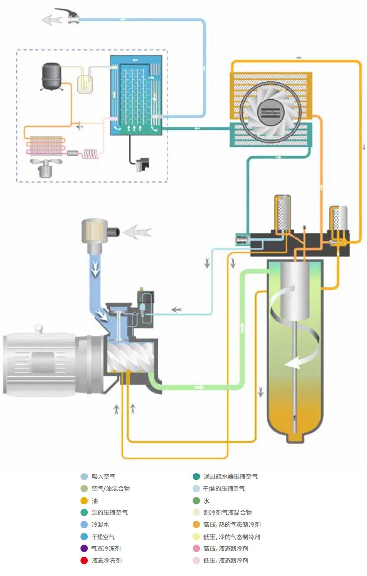 · Riippumaton jäähdytystuuletin, tehokas jäähdytin ja sisäänrakennettu kuivausrumpu 5 ℃:n kastepistepaineella, jotta voidaan paremmin välttää kondenssiveden ja putkien korroosiota putkiverkostossa