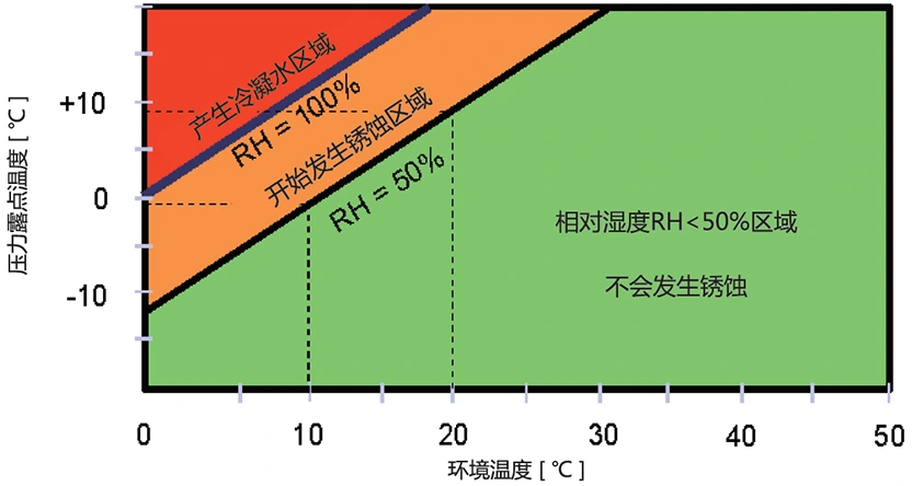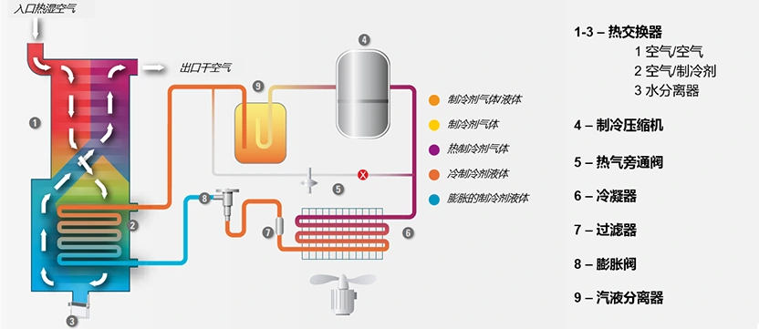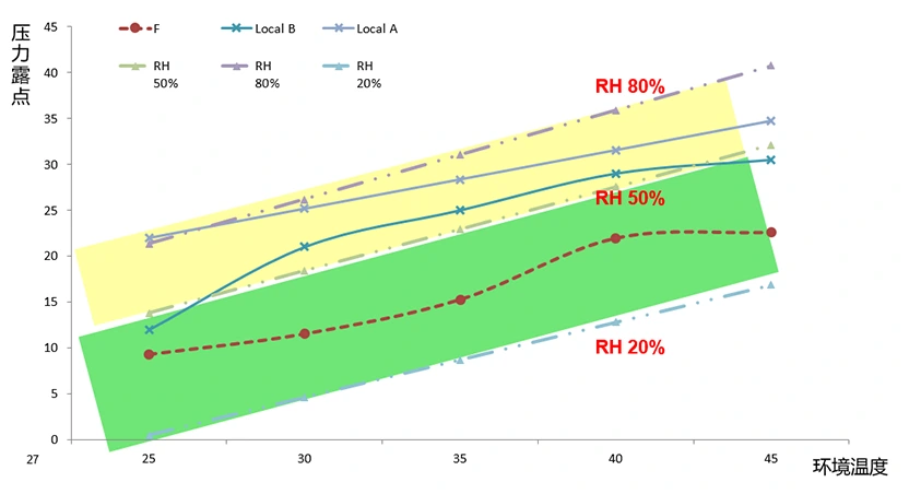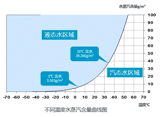 Kuvassa ilmaan mahtuu eri määrät vesihöyryä eri lämpötiloissa. Ilma jäähtyy ja myös sen vesihöyryn taso laskee. Käyrässä on pisteitä, jotka osoittavat kylläisen vesihöyryn tasoja. Jokaisen pisteen lämpötila on kastepiste. Alempi kastepiste tarkoittaa vähemmän vesihöyryä paineilmassa. Jäähdytysilmakuivaimet käyttävät tätä fyysistä sääntöä. Ne antavat paineilman vaihtaa lämpöä kylmäaineeseen. Tämä toimenpide laskee paineilman lämpötilaa. Jäähtyneen ilman vesihöyry muuttuu nestemäiseksi vedeksi. Tämä neste valuu pois järjestelmästä. Esimerkiksi paineilman kylläinen vesihöyrypitoisuus 35℃:ssa on 39,286 g/m³. Kylmäaineen kanssa tapahtuvan lämmönvaihdon ja 3℃:een jäähdyttämisen jälkeen kyllästetyn vesihöyryn pitoisuus on 5,953 g /m³. Ero 33,333 g /m³ ilmaisee veden määrän, joka on poistettu pakastekuivaimen jäähdytyksen ja kuivauksen jälkeen. Toisin sanoen, kun paineilma on kulkenut pakastekuivaimen läpi, noin 85 % kosteudesta poistuu, mikä varmistaa, että paineilman kuivaus täyttää tuotantoprosessin vaatimukset.