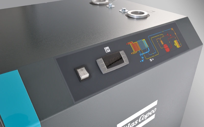 Atlas Copco F-tyyppinen jäähdytetty ilmankuivain käyttää kolme-yhdessä-lämmönvaihdinta, joka yhdistää ilman/ilman, ilman/kylmäaineen ja veden erottimet. Tämä poistaa tehokkaasti jäähdytyksen jälkeen erotetun nestemäisen veden ja esijäähdyttää paineilmaa, mikä parantaa lämmönvaihdon tehokkuutta.